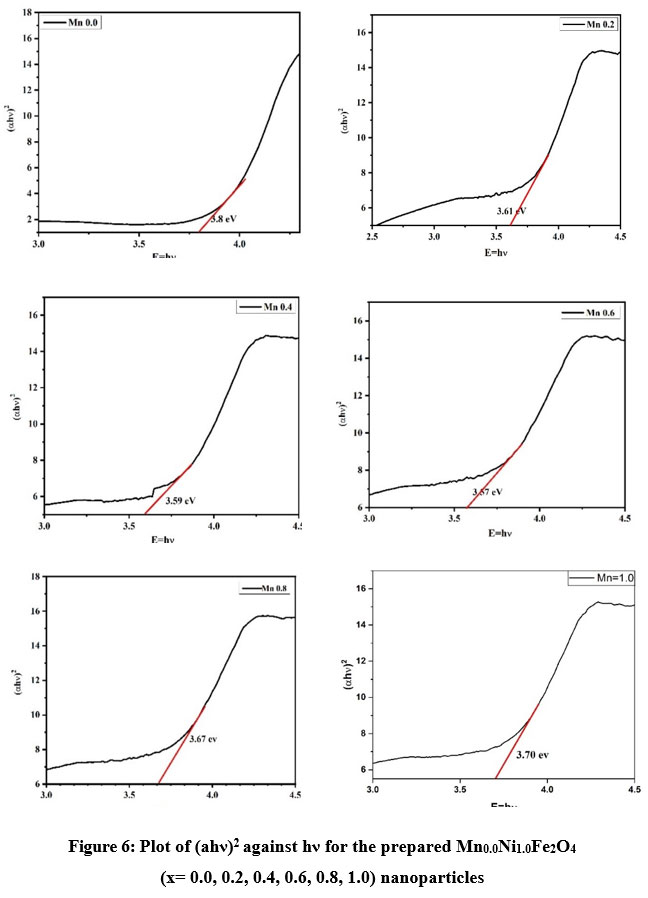From absorption spectra, the variation in Mn composition in Ni ferrites causes the absorption change in the UV section about 300 nm (for Mn0.8Ni0.2Fe2O4) moves to longer wavelength visible region. This shifting to longer wavelength can be attributed to changes in electronic structure and composition of the material. Manganese doping alters the energy level and band structure, affecting absorption characteristics and again increase in absorption wavelength. To examine influence of Manganese effect on optical band gap, the Tauc equation is used for fitting absorption data17.