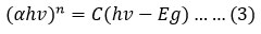 where C is proportionality constant, h is Planck constant, Eg is band gap, n is an integer which is ‘2’ for direct band gap transition in present study and α is the absorption coefficient.