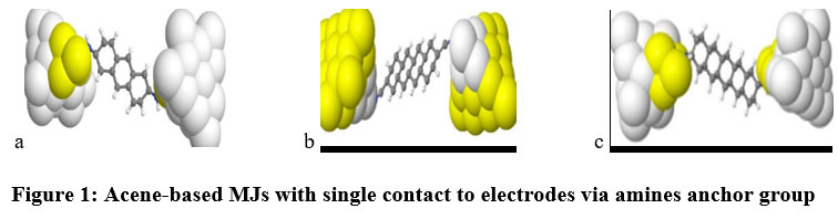This work involves a modelling of the extended structure, energy band calculations as well as charge transport simulations. Modellings of the structures was done using modelling and visualization software called Jmol. Figure 1, illustrates some of the MJs formed using some members of an acene group. Throughout this work, gold (Au) was maintained as an electrodes (leads/reservoirs) and they are connected in para-positions18. The structure optimization and energy band calculations were performed using DFT technique as implemented in FHI-aims computer code19, with the Perdew-Burke-Ernzerhof (PBE) exchange correlation functional. Transport properties of the system were investigated using Non-equilibrium Green’s Function (NEGF) formalism approach as implemented in the Aitranss computer code20, 21, 22.