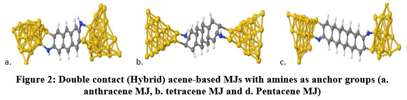 Figure 2: Double contact (Hybrid) acene-based MJs with amines as anchor groups (a. anthracene MJ, b. tetracene MJ and d. Pentacene MJ). |