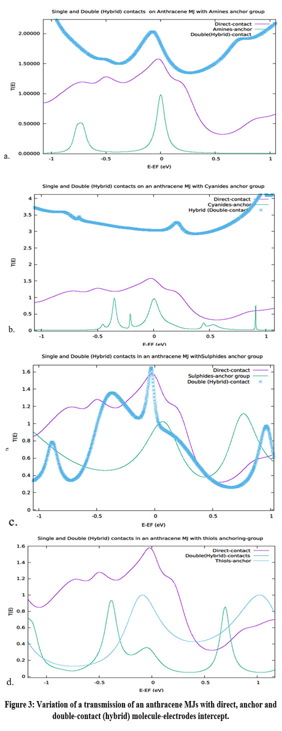 Figure 3: Variation of a transmission of an anthracene MJs with direct, anchor and double- contact (hybrid) molecule-electrodes intercept. |