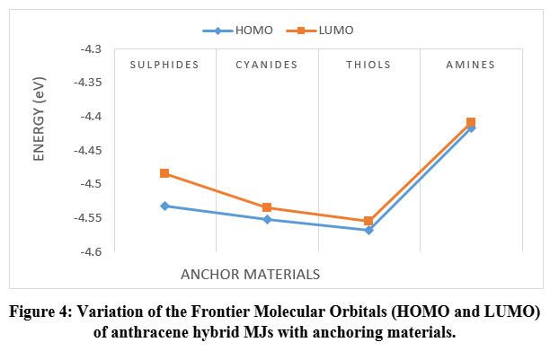 Figure 4, is the frontier orbitals energies for the hybrid anthracene MJs formed using four different anchor materials. The HOMO-LUMO gap of these compounds decreases significantly from 0.049 to 0.008 eV. It can be seen that, the sulphides anchor MJ, the gap has wider gap followed by cyanides and thiols with gap of 0.018 and 0.012 respectively. MJ made up with amines as anchor group has a least HOMO-LUMO gap of 0.008.