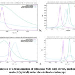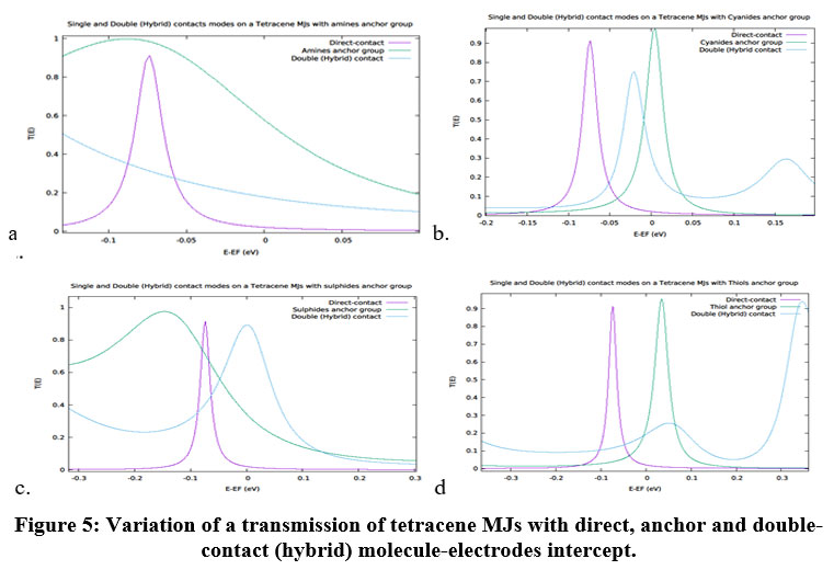 As it can be observed, the transmission of a tetracene MJ using direct method is 0.021. When amines was used as molecule-electrode anchor (a), the T(EF) value rises to 0.59 and for a hybrid MJ, the T(EF) falls to 0.18. For the cyanides anchor tetracene MJs (b), the T(EF) value is 0.91, while it is 0.32 for its hybrid. When the sulphides anchor groups are applied, the T(EF) value is 0.35, while it is 0.89 for its hybrid form. Lastly, the T(EF) value for tetracene MJ with thiols anchor group is 0.23 and it is 0.19 for the hybrid.