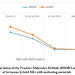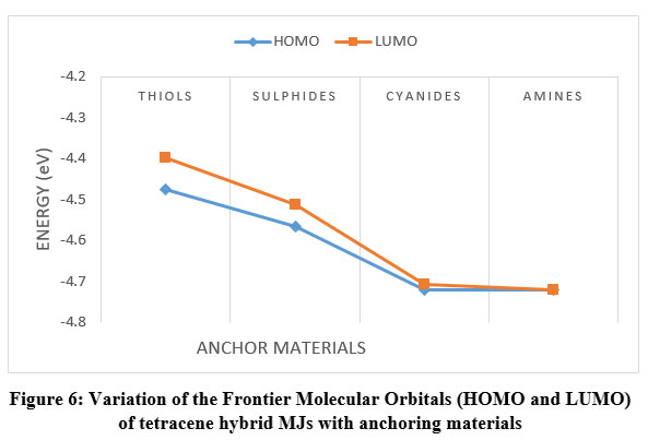 Figure 6: Variation of the Frontier Molecular Orbitals (HOMO and LUMO) of tetracene hybrid MJs with anchoring materials |