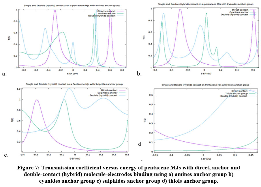 For the tetracene MJs, the transmission coefficients T(E) for a MJs formed using direct-contact, π-anchor and hybrid methods against energy (E) are displayed in Figure 5 (a-d). In these figures, the MJs are designed using amines,cyanides, sulphides and thiols as anchor groups respectively.