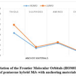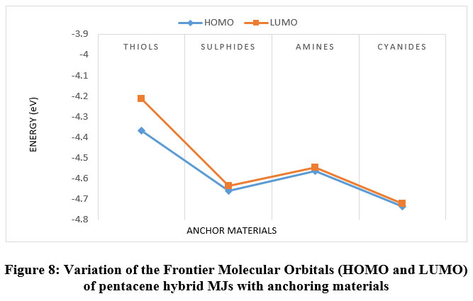 Figure 8: Variation of the Frontier Molecular Orbitals (HOMO and LUMO) of pentacene hybrid MJs with anchoring materials. |