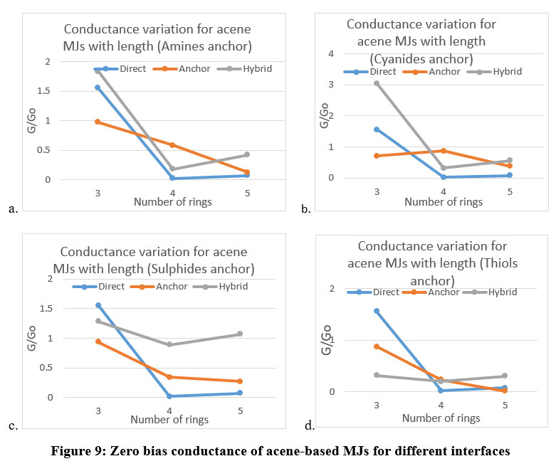 Lastly, the results also demonstrate that, the lower acene derivatives have a non-exponential length dependence of the conductance. The connection to the electrodes (coupling) dictates the conductance behavior. This signifies that, the molecules anchored through anchoring materials demonstrated a traditional conductance decay with length, whereas molecules anchored via hybrid method and those with direct π-metal contact exhibit conductance fluctuations with molecular length. Thus, by improving the conductance and overcoming the exponential conductance decay, hybrid MJs will be a very good and cost effective organic molecular components of the next-generation nano electrical circuit.