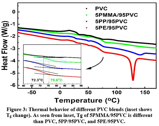 Figure 3: Thermal behavior of different PVC blends (inset shows Tg change). As seen from inset, Tg of 5PMMA/95PVC is different than PVC, 5PP/95PVC, and 5PE/95PVC. |
