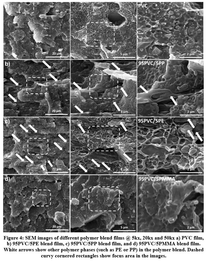 The morphology of blends is evaluated by some aspects such as scale, geometry, and spatial distribution of phase separation and so on. It is directly influenced by the type of polymers and ratio of the components. Polymer blends can be classified as miscible blends and immiscible blends due to separation of the phases. While miscible blends behave as one single phase, immiscible blends tend to exhibit continuous and dispersed phases and dispersed phase is generally observed as spherical, particle, plate or channel-like geometry in the continuous phase especially at low concentrations. In our case, PVC, 95PVC/5PP, 95PVC/5PE, 95PVC/5PMMA were chosen for morphology analysis. To analyze the phase morphology and phase interphase, FESEM images were given at different magnifications such as 5k, 20k and 50kx. While low magnification images were given to observe the continuous and dispersed phases, high magnification images are useful to observe the size, geometry and interphase of the phases. Fig. 4a is the cross-sectional image of PVC film. PVC has been successfully melted. As previously mentioned, an industrial recipe was used for preparation of PVC compound and the particles throughout the film cross-section were probably inorganic materials such as CaCO3 and TiO2. These particles were also observed for all blends. 95PVC/5PP based blend film can be seen from Fig. 4b. PVC was the continuous phase and PP phase was not found to be miscible in PVC matrix. PP phase was indicated by arrows in SEM images. The morphology of PP phase was almost like stretched plates and stretched channels. 95PVC/5PE based blend film can be seen from Fig. 4c. PVC was the continuous phase and PE phase was not found to be miscible in PVC matrix that was also reported in previous studies 32. As shown by the arrows in FESEM images, the morphology of PP phase was almost like elliptical particles. 95PVC/5PE based blend film was shown Fig. 4d. Unlike PP and PE blends PMMA was found to show higher miscibility in PVC. As previously mentioned in FTIR analysis, the miscibility of PMMA in PVC was reported to be caused by interaction between -CHCl and C=O groups of PVC of PMMA, respectively 30.