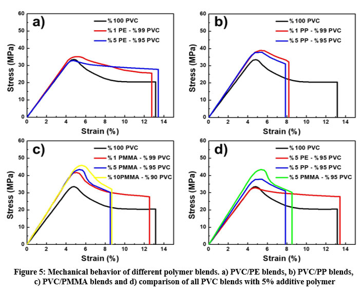 Figure 5: Mechanical behavior of different polymer blends. a) PVC/PE blends, b) PVC/PP blends, c) PVC/PMMA blends and d) comparison of all PVC blends with 5% additive polymer |