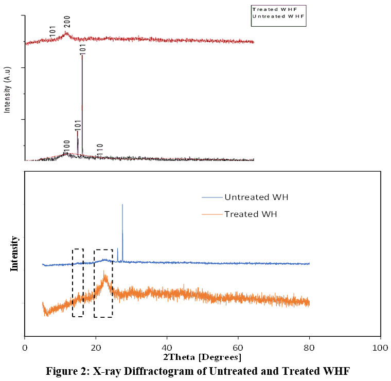 The XRD diffractogram characterization shows that the untreated WH fibre is crystalline in nature, while the alkaline treated WHF is amorphous. The crystallinity index of untreated WH fibre is 6.1 % and the treated with 10 % NaOH is 41.2 %. Therefore, NaOH treatment enhanced the crystallinity of WH fibre, and the increment is related to the dissolution and removal of amorphous fraction present in the fibre.