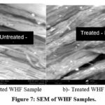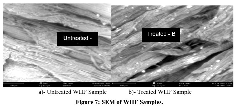 The morphology of the untreated WH fibre showed a well-shaped fibril with a rigid lignin structure coated surface with the capacity to hold the liquid contents with good absorbency. The 10 % NaOH treated WHFs showed significant differences in the morphological and structural characteristics compared with the untreated WHFs. The differences were due to the removal of the impurities in the untreated WHFs.