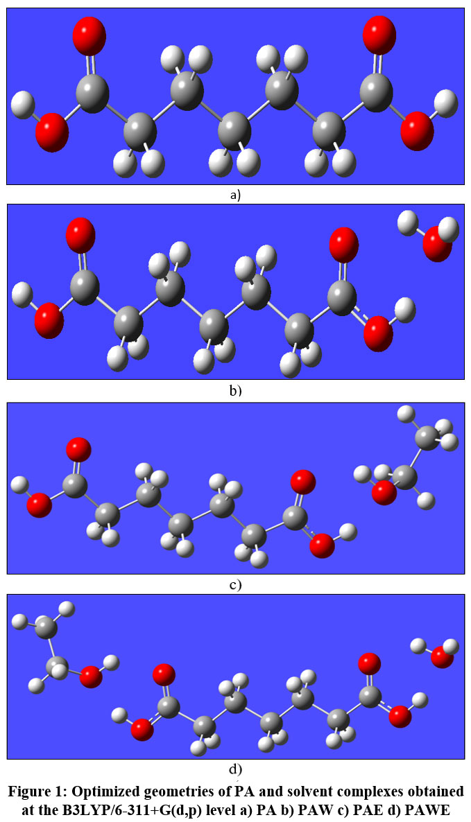 These studies establish a strong methodological foundation for applying DFT to PA in mixed solvent systems. However, a detailed theoretical investigation of PA in water–ethanol mixtures—focusing on hydrogen bonding dynamics, vibrational shifts, reactivity indices, and IR spectral features—remains underexplored. The present study aims to address this gap by employing DFT calculations at the B3LYP/6-311+G(d,p) level to investigate the structural and electronic modifications in pimelic acid resulting from interactions with binary and ternary solvent systems. Although Gaussian 03 is not the most recent version, it was used in the present study to ensure consistency and reproducibility with our earlier related works6-7.