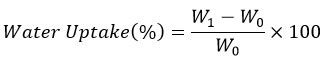 Water uptake studies were conducted following ASTM D570 to evaluate the relative water absorption of the SPI films. Samples were cut into 1 cm x 1 cm square pieces and kept at 60°C to remove extra moisture absorbed by the film. Following this, all samples were kept at 0% relative humidity (RH) in a dessicator to ensure uniform initial moisture content. The initial dry weight of each sample (W0) of each specimen was recorded. After that, the samples were immersed in 20 ml of distilled water for 24 h. Following soaking, the final weight (W1) was obtained after the surface water was removed with tissue paper. The following formula was used to determine the percentage of water uptake: