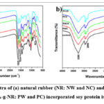 Figure 1: FTIR spectra of (a) natural rubber (NR: NW and NC) and (b) PMMA-grafted NR (PMMA-g-NR: PW and PC) incorporated soy protein isolate films.