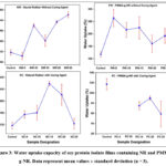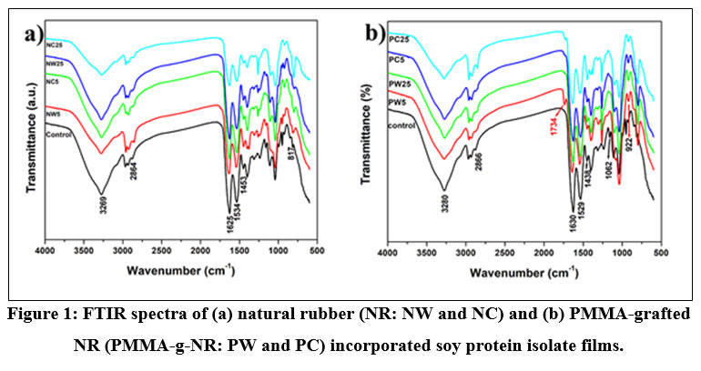 Table 2: Mechanical properties of NR and PMMA-g-NR incorporated soy protein isolate films. The data were presented as mean±SD with ‘n’ number of repeats (n = 3).