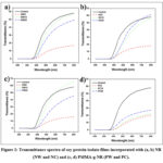 Figure 2: Transmittance spectra of soy protein isolate films incorporated with (a, b) NR (NW and NC) and (c, d) PMMA-g-NR (PW and PC).