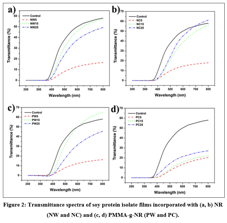 The UV-Vis transmittance data indicated that PMMA-g-NR incorporated films maintained better clarity than NR-only films, especially at higher loadings. This could be attributed to better compatibility and dispersion of PMMA chains in the protein network. The improved UV resistance of all rubber-incorporated films also points to the light-scattering effect of embedded rubber domains, which enhances protection against photo-degradation, a feature particularly desirable in biodegradable packaging films.