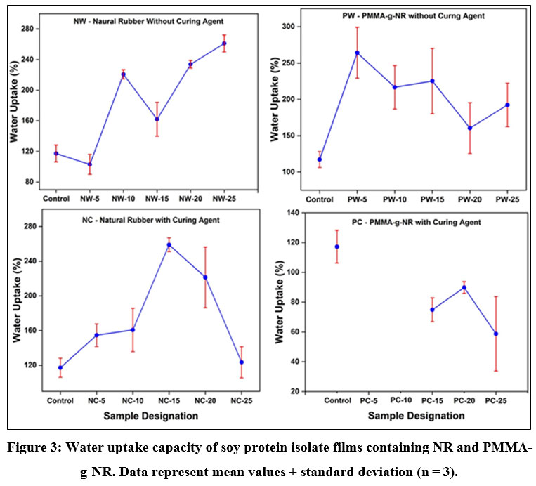 The control SPI film exhibited a water uptake of approximately 120%, as shown in Figure 3. NR-incorporated films without curing agent showed a concentration-dependent increase in water uptake, peaking at NW-25 (~260%), indicating greater matrix swelling. In contrast, NR films with curing agent exhibited relatively lower uptake at higher concentrations (e.g., NC-25) due to enhanced crosslinking and reduced hydrophilicity. PMMA-g-NR based films with or without curing agent showed better water uptake behaviour and were more hydrophobic than the control and NR films. PC25 showed the lowest water absorption (~70%), suggesting improved water resistance due to the synergistic effects of PMMA-g-NR and curing agent. PC5 and PC10 were delicate and could not be retrieved in an intact state to perform further analysis.