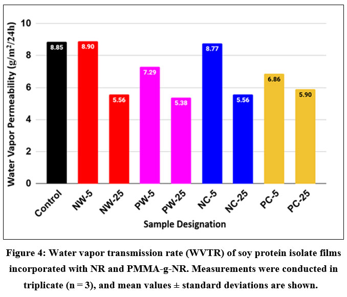 Water uptake and WVTR results further highlighted the effectiveness of crosslinking in improving moisture barrier properties. Films with higher concentrations of NR or PMMA-g-NR showed significantly reduced water absorption and vapor transmission, suggesting successful reduction in matrix porosity and enhancement in hydrophobicity. The improved water uptake and WVTR properties are due to the hydrophobic nature of NR and PMMA-g-NR. Curing agents create additional crosslinks between polymer chains, resulting in a more compact network structure, which reduces free volume and molecular mobility, making it harder for water molecules to penetrate.