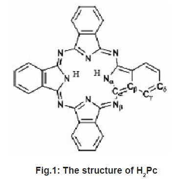 Phthalocyanines are porphyrin derivatives that are characterized by a high degree of symmetry, planarity and electron delocalization. Phthalocyanines, has received considerable attention as charge generating materials in electrophotographic receptors, in solar cells, as organic semiconductors, in optical-data storage and in non-linear optics. Phthalocyanines are a class of materials which is most extensively investigated because of their great structural flexibility, and can host ~70 different elements in the central phthalocyanine cavity and also a large range of peripheral substituents of phthalocyanines is known to improve the poor solubility of the unsubstituted phthalocyanine. They consist of isoindole rings at the four corners linked together by four nitrogen atoms. The middle is a 16 membered ring called the macrocycle in which the two imino-hydrogen atoms are replaceable by metal. The space within the four central nitrogen atoms when occupied by hydrogen atoms become metal- free phthalocyanine or H2Pc and when by metallic ions having coordination number greater than four to become metal substituted phthalocyanine or MPc. The metal atom is held by the two isoindole N atoms of H2Pc by primary valencies and is coordinated by the other two N atoms of the macrocycle to form four chelate rings adding greater stability to the structure than H2Pc. Metal-free phthalocyanine (H2Pc) is known to exist in polymorphic forms of the types; face centred monoclinic β-H2Pc, the tetragonal α-H2Pc, and the hexagonal x-H2Pc and τ-H2Pc which are intermediate between α and β H2Pc, all differing substantially in electronic conductivity and photoactivities. The structure of H2Pc is presented in Fig.1. The polymorphs have different stack arrangement and different stacking overlap of adjacent molecules. The electronic properties are related to the overlap of electron wavfunctions and the stacking habit of molecules. The α-H2Pc has a large intermolecular P wavefunction overlap resulting in a large carrier mobility. The intermolecular interaction and the stacking habit of molecules are considered to affect low wave-number Raman spectra in α-H2Pc which exhibits two peaks at 90cm-1and 132 cm-1 while other polymeric forms of H2Pc have only one band at 132cm-1 that have not been identified with a characteristic vibrational mode.1