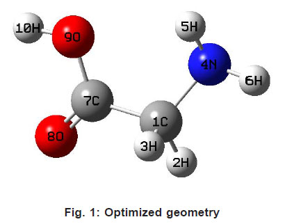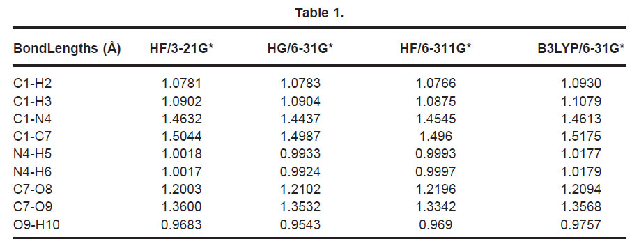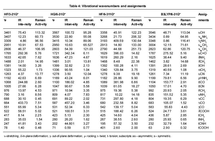 Amino acids, which constitute a very class of biomolecules, can act as potential oxygen and nitrogen donor ligands. It has been found that they utilize their functional groups as fully as possible in metal conduction.1 Copper(II) complexes of amino acids present important pharmacological interest as several of them show a wide spectrum of effects, including anti-inflammatory, antiulcer, anticonvulsant and even anittumoral activities.2-6 Summayya et al.7 reported the vibrational spectroscopic studies and ab initio calculations of L-glutamic acid 5-amide. Kumar et al.8 reported the vibrational spectrum of glycine molecule. In the present study, the wavenumbers of the title molecule and geometrical parameters are calculated theoretically at various computational levels and compared with the reported data.