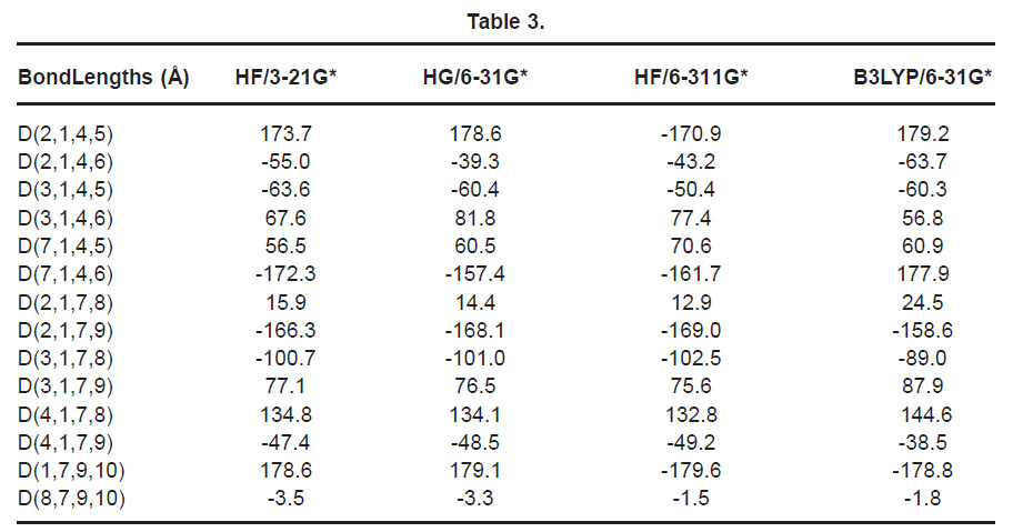 The vibrational wavenumbers were calculated using the Gaussian03 software package on a personal computer.9 The computations were performed at HF/6-21G*, HF/6-31G*, HF/6-311G* and B3LYP/6-31G* levels of theory to get the optimized geometry (Fig. 1) and vibrational wavenumbers of the normal modes of the title compound. DFT calculations were carried out with Becke’s three-parameter hybrid model using the Lee-Yang-Parr correlation functional (B3LYP) method. Molecular geometries were fully optimized by Berny’s optimization algorithm using redundant internal coordinates. Harmonic vibrational wavenumbers were calculated using analytic second derivatives to confirm the convergence to minima in the potential surface. The DFT hybrid B3LYP functional tends also to overestimate the fundamental modes; therefore scaling factors have to be used for obtaining a considerably better agreement with experimental data. Thus, a scaling factor of 0.9613 has been uniformly applied to the B3LYP and 0.8929 for HF methods calculated wavenumbers.10 The observed disagreement between theory and experiment could be a consequence of the anharmonicity and of the general tendency of the quantum chemical methods to overestimate the force constants at the exact equilibrium geometry. The obtained geometrical parameters are given in Tables 1-3.