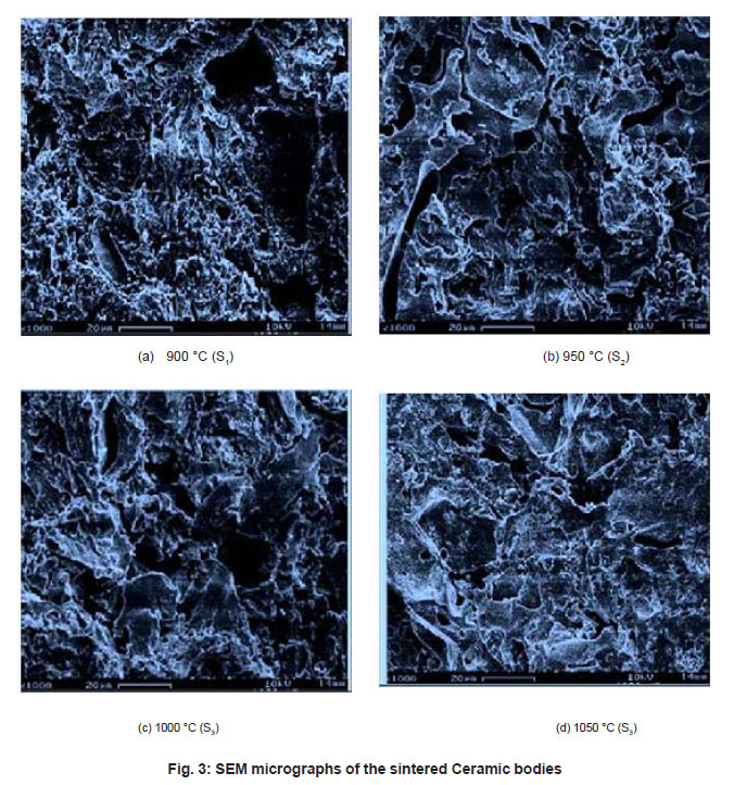 Figure 3 show the microstructure of the Ceramic bodies sintered at various temperatures. SEM micrographs, taken at increasing firing temperature show the typical sequence of enhanced densification with increasing temperature, characteristics of all studied formulations in this work.